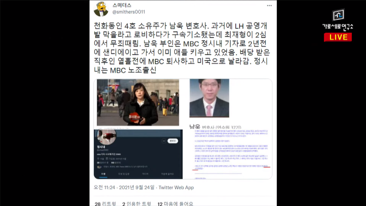 더욱 놀라운 건 정시내 기자의 과거 행적인데요. 경기 성남시의 대장동 개발 특혜 의혹의 핵심 인물 중 한 명인 남욱 변호사의 부인 아내인 전직 mbc 기자가 재직 당시 위례신도시 개발회사 임원으로 등재됐다고 mbc 노동조합이 2021년 9월 27일 밝혔답니다. 더 대박인건 위례판 화천대유 자회사 위례파트너 3호 소유주라고.